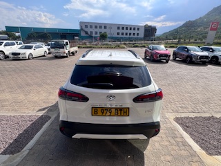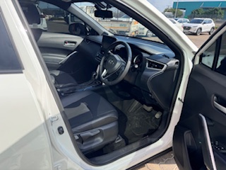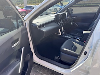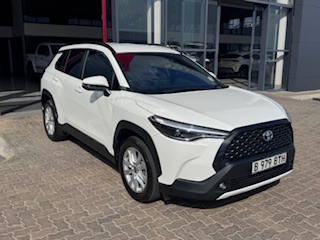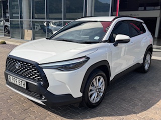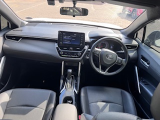 The 2023 Toyota Corolla Cross 1.8 XS (South Africa spec) features a 1.8L petrol engine (non-hybrid) with 103 kW 172 Nm, a CVT transmission, 17-inch wheels, standard safety (ABS, EBD, 5 airbags, stability control) with Smart Entry, Push Start, and multi-function steering, trimmed in black partial leather with cloth, offering convenience like auto air-con and electric windows
